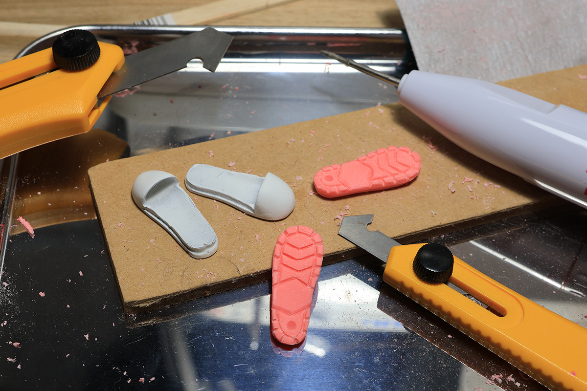 理想を言えば複雑なパターンで掘りたいが、たかだか35mm*10mm程のパーツじゃ限界があった。つま先はこれまで軟質素材を湯煎して型取りしていたが、毎度大変なので一体型のパーツを作った。