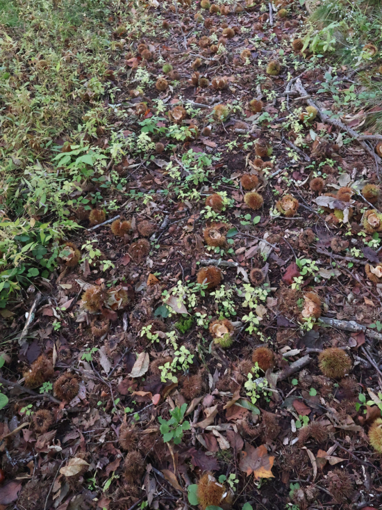 開いているイガも多いが、自然と開いた感じなので人間はまだ来ていないようだ。青いイガも有るし大丈夫だろう!