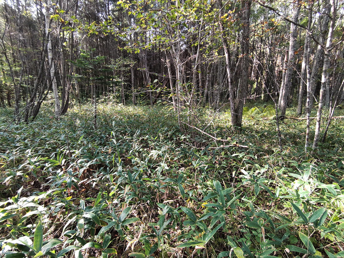 これがもう大変で、笹薮は脚を取られるし灌木や倒木も多く、中々前で進めない。たかが200mがとても遠く感じた(;´Д`)
