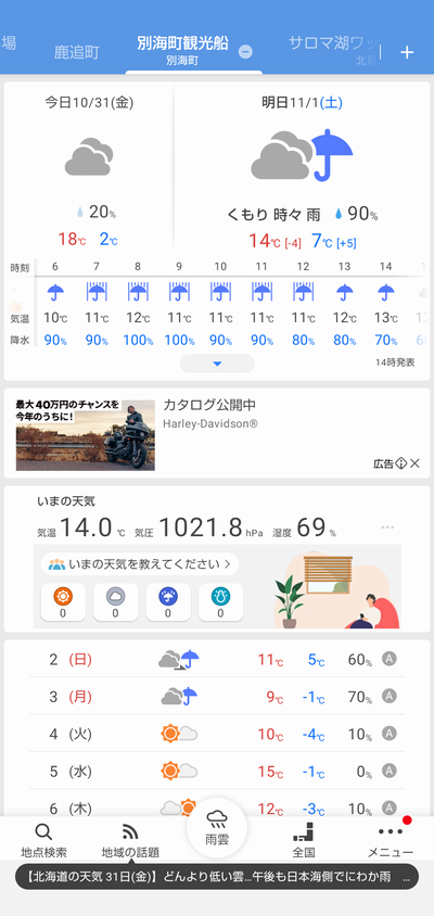 ピンポイントで雨って・・・週末はずっとこんな感じ。異常なまでに週末に雨が降るのよ。土曜日を移動日にするとしても、昆布刈石や厚岸など、観たい景色は多い。身体の調子も思わしくない状態で行っても後悔しか無さそうなので、今回は諦め。11月中のどこかで行けたら良いな。