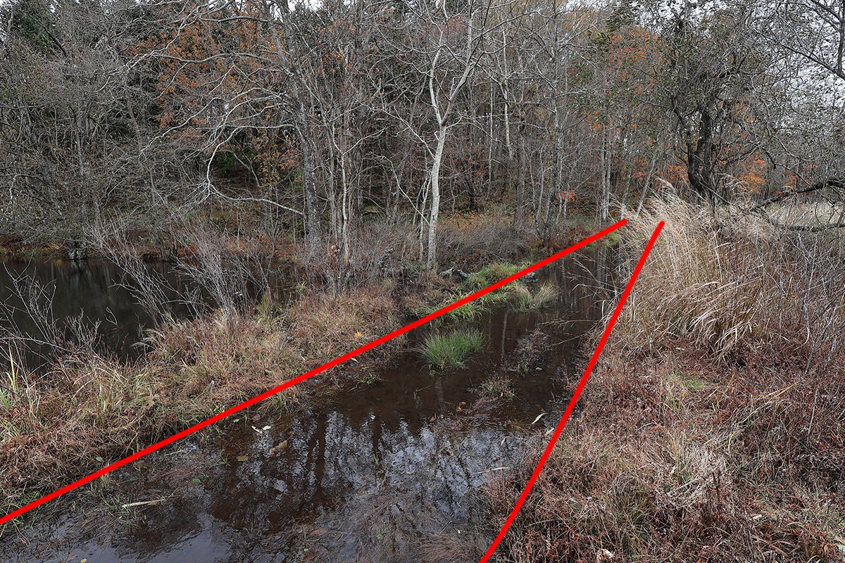 これはもうだめかもだなぁ。完全に沼化している。流れが有るので土が運ばれて深くなっているしね。地盤が悪いので、うっかり足を入れるとズボッと埋まる可能性が。根の張っている横を歩いて何とか渡れた。