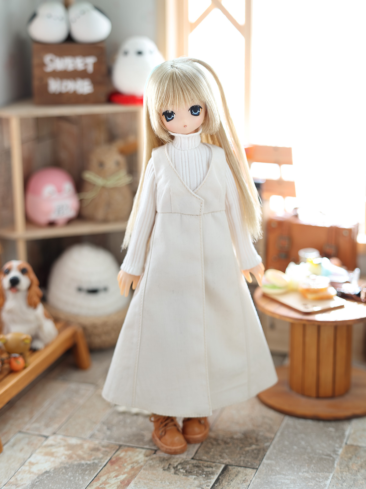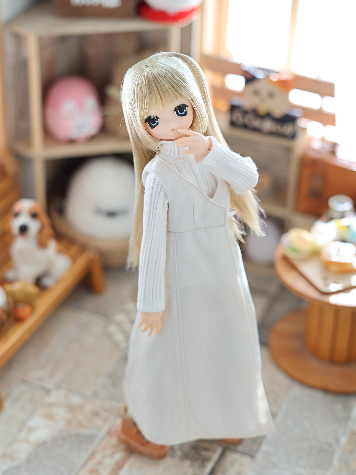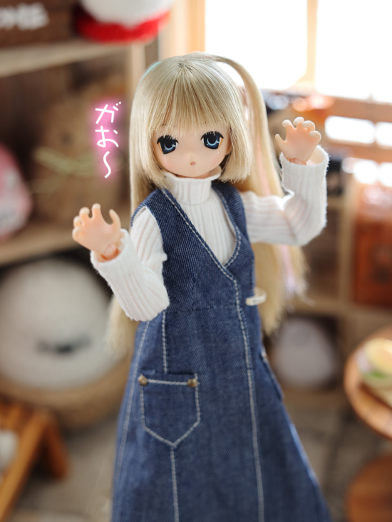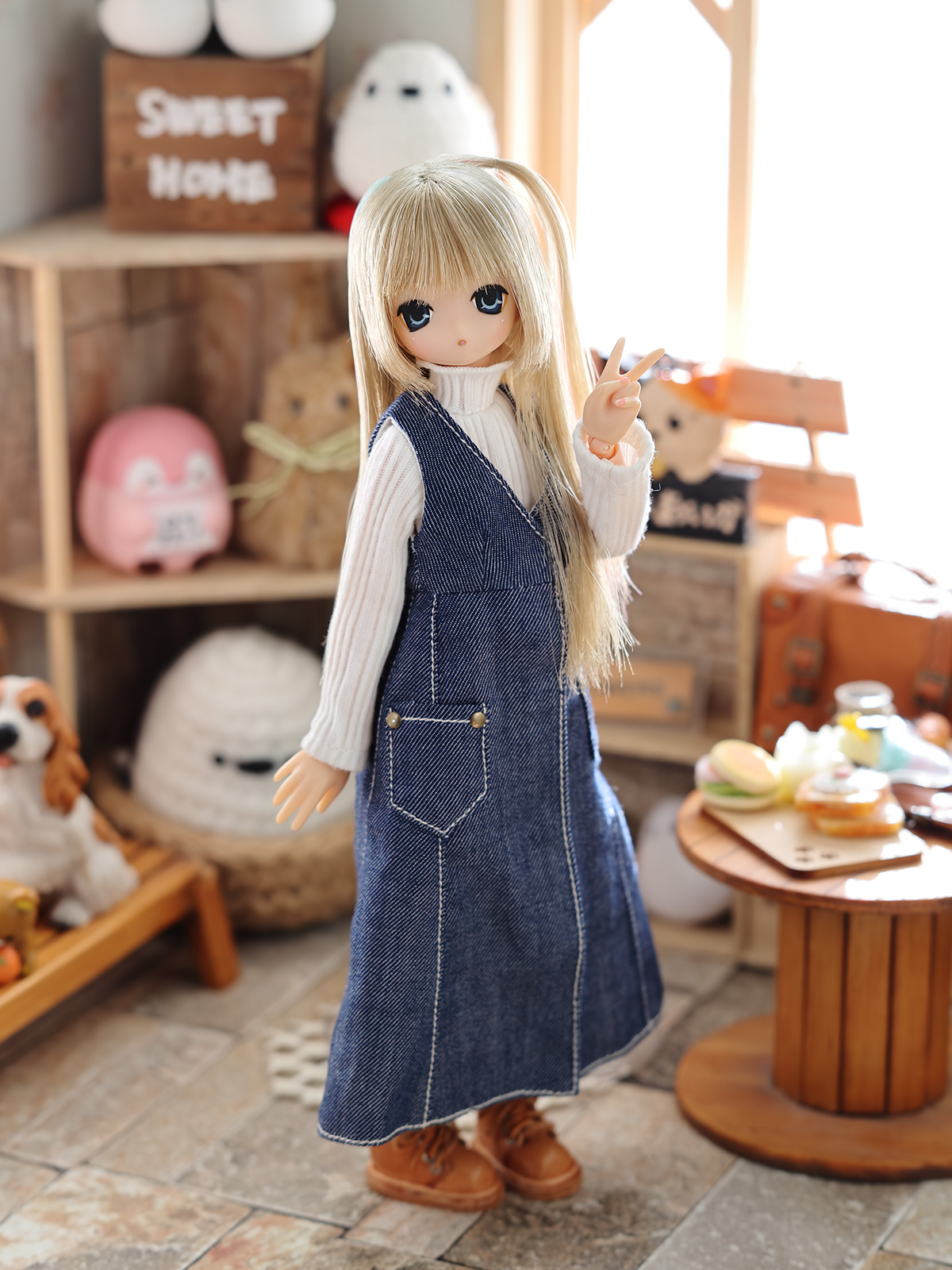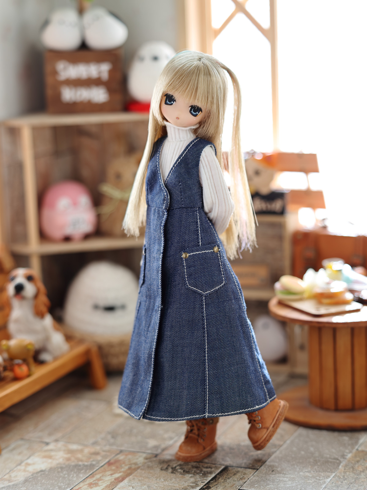 表題通りだが、デニム生地でジャンパースカートを作った。型紙を新規で作っており、これから定番となる程度に完成度を高められた。目指したのはストンと落ちるAシルエット。ドールのスカートは裾を広げがちだが、これはリアルのジャンスカ同様、蹴回しを狭くした。