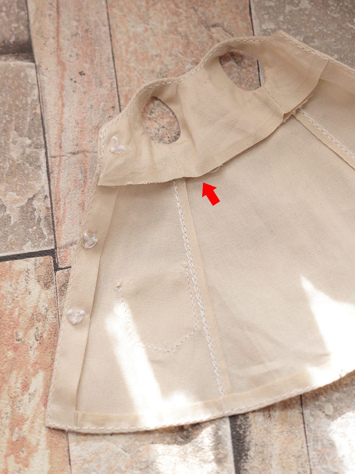 ここは一方向へ折りたたみ、裏地も折って「まつり縫い」が正攻法。ただ、1/6ですら厚みが気になるのに1/12で同じことをするとシルエットが乱れる。仕方ないので表地は開き、裏地は折らず一枚でフリーにした。ただ、裏地の切りっぱなし丸見えはどうかと思うので、次作は手を考える( ・ิω・ิ )