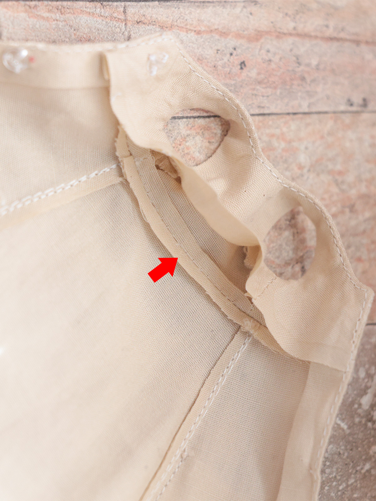 アームホール部分も随分と調整を繰り返した。あとこれ、見頃って呼んでいいのかな、上は総裏仕様。さすがに裏返せないかと一枚の予定だったが、やってみたら裏返った。赤矢印の部分は良い始末方法が思いつかず切りっぱなし(;´Д`)