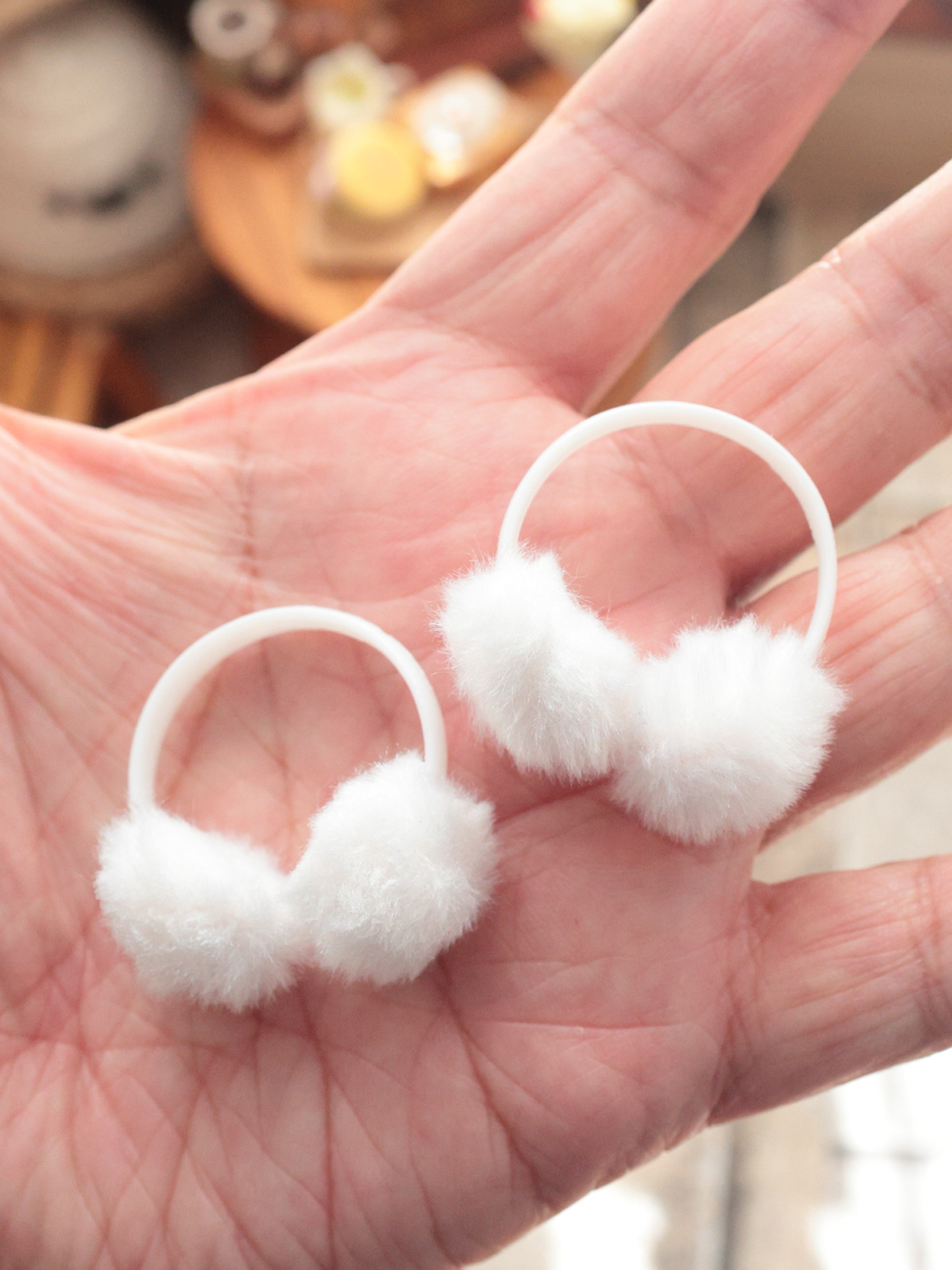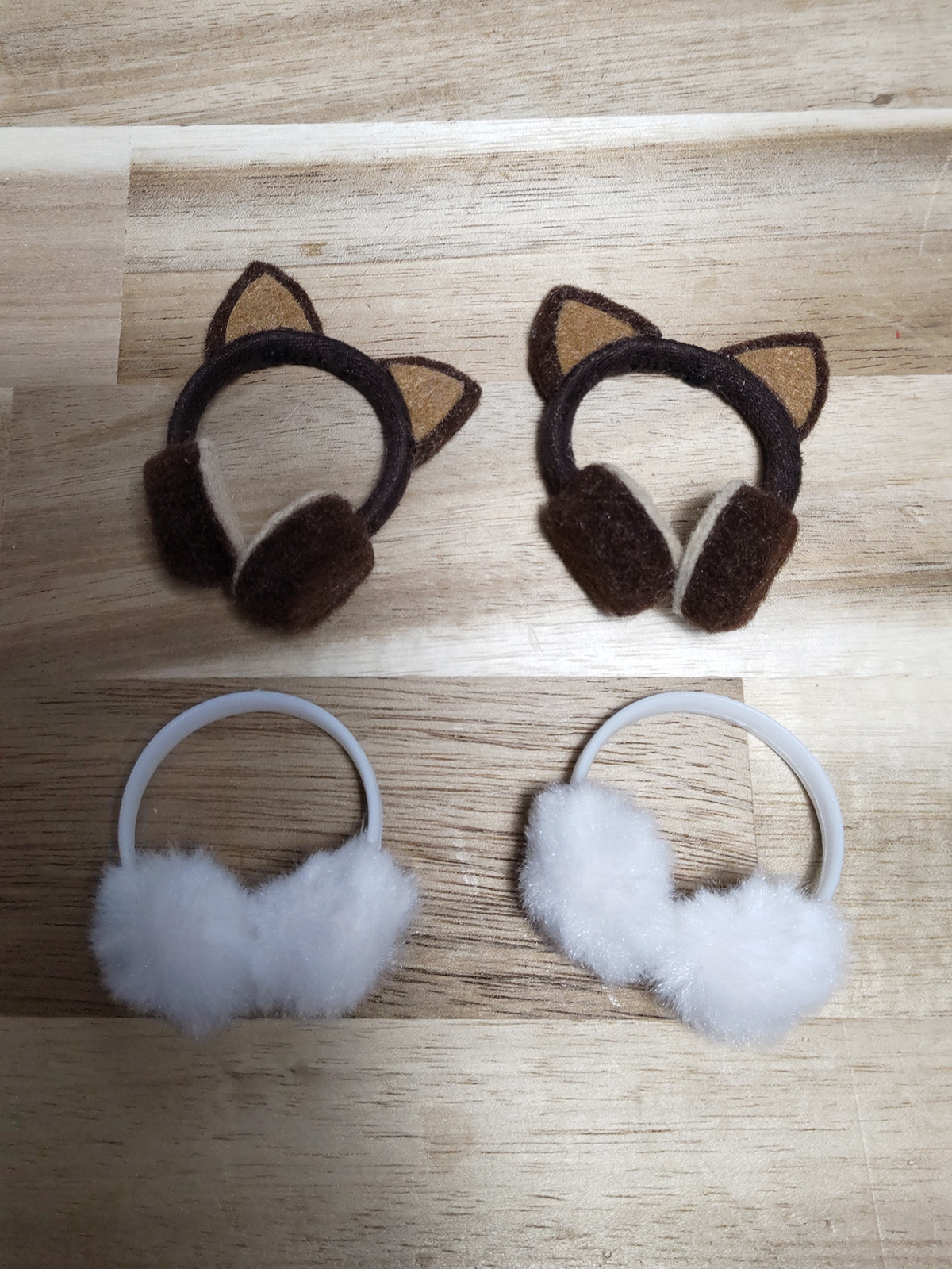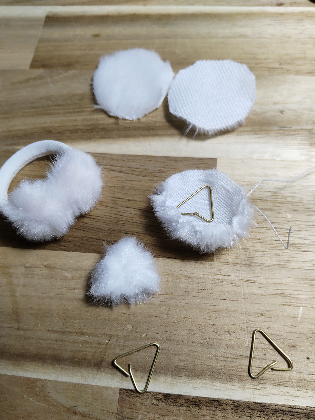 何か手軽な方法は無いものかと考えた結果、半球パーツをカチューシャに接着し、丸くカットしたモフモフ生地の周囲を並縫いしたもので包んで絞るって方法を思いついた。