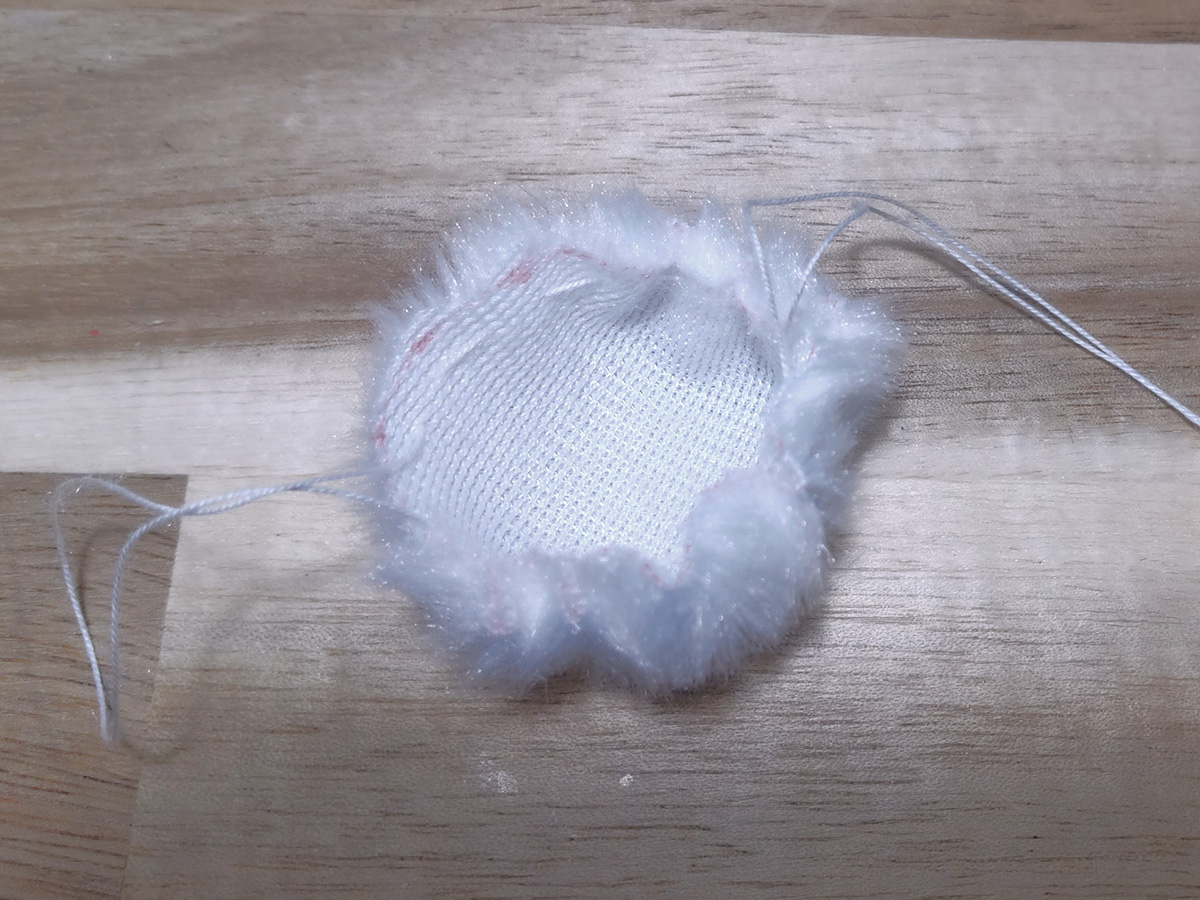 あとは丸くカットしたモフモフ生地の周囲を並縫いし、被せて絞るだけ。