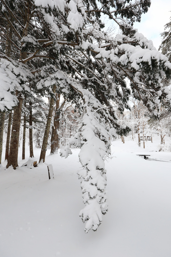 枝に乗った雪が重たくて地面近くまで枝が垂れ下がっていた。