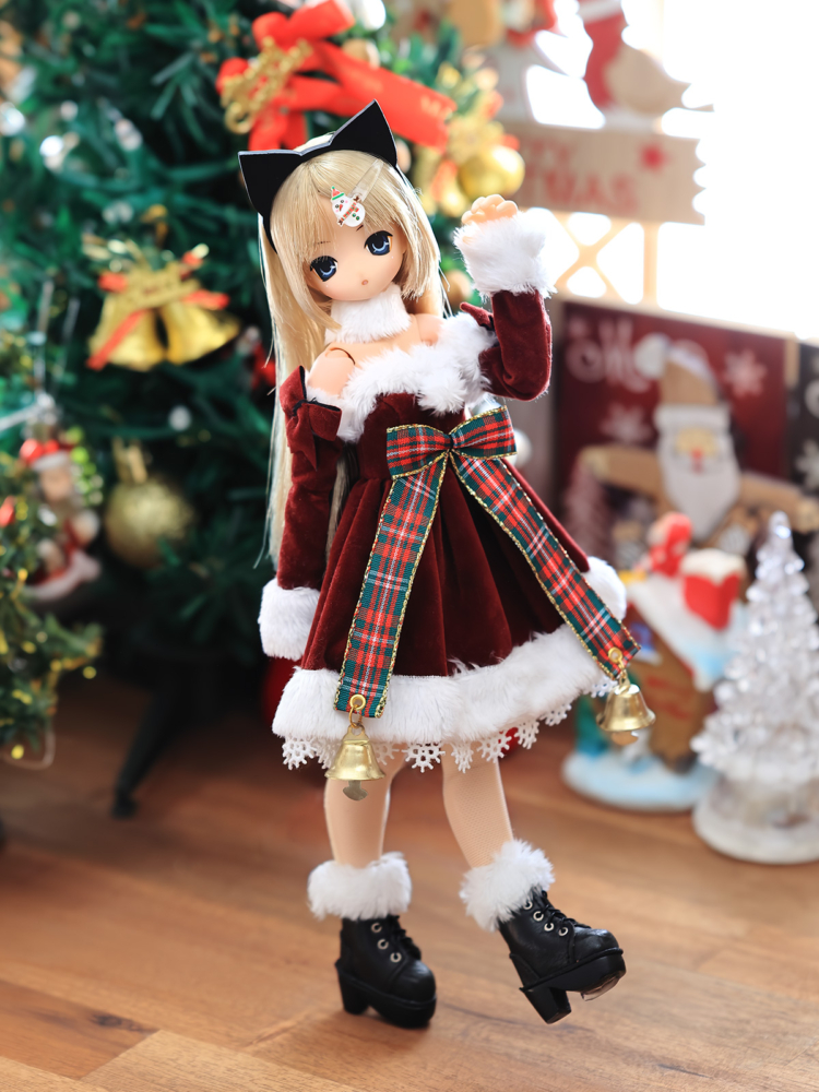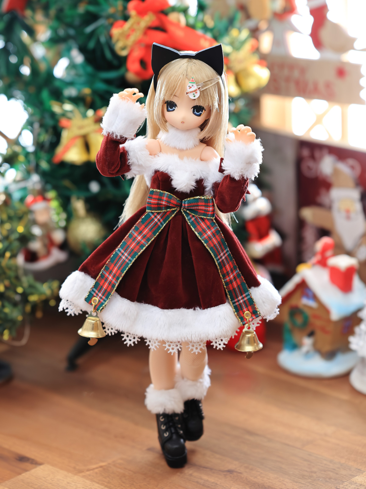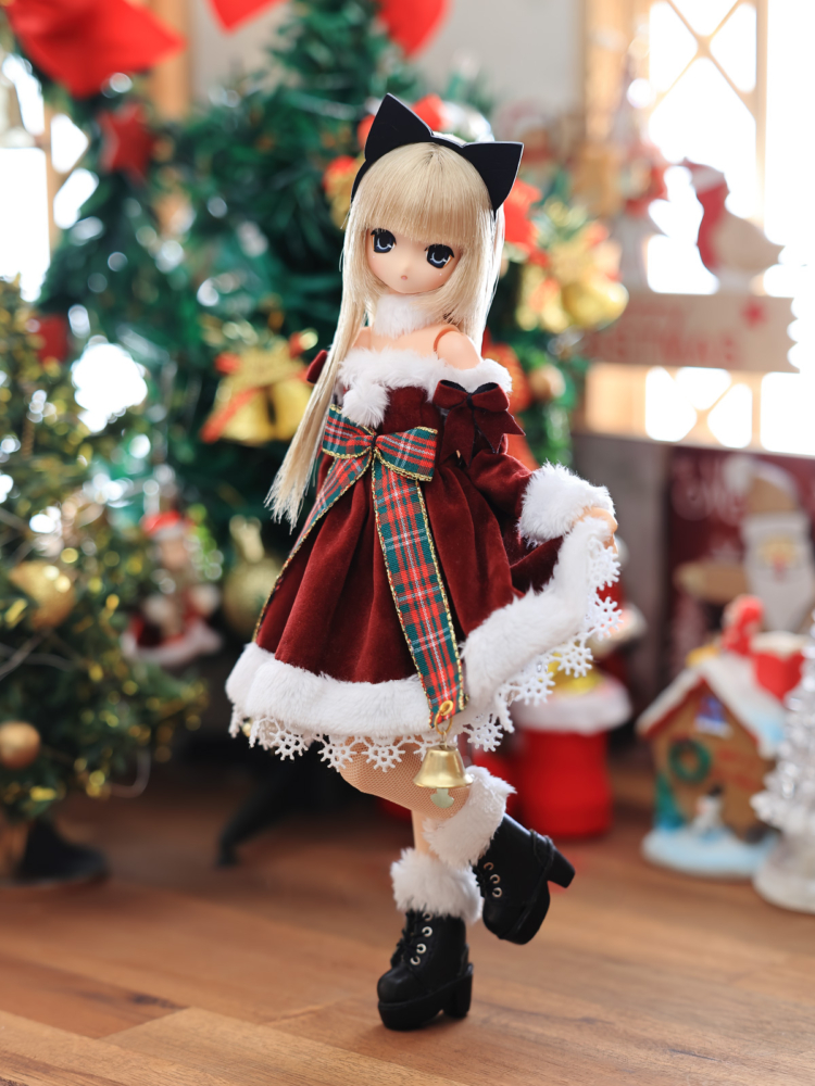 資材が間に合わないことが確定し、とりあえず代替品が無いかとダイソーに行って見つけたギンガムチェックのリボンテープと、別な百均で買ったベル。ベルの方はリボンと柊木の葉が付いたようなモチーフで二個セット。本体が出来たとき何となくテープでリボンを作ったのだが、これが思いの外に良いアクセントになった。ベルはリボンが広がらないための重しになっている。