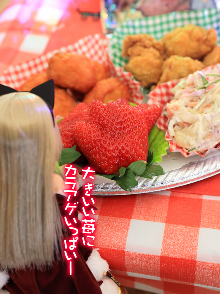LAWSONのからあげクンや苺、ローストビーフ等をテーブルに並べた。