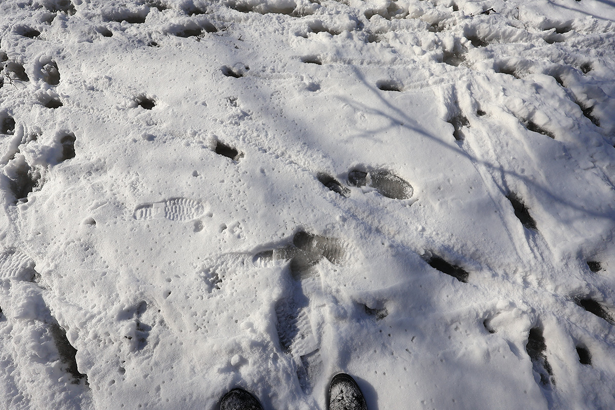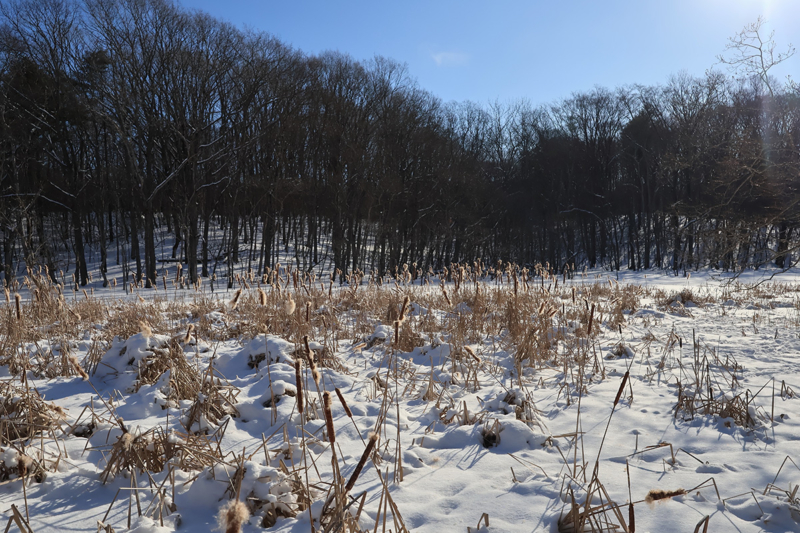 森は一昨日降った雪がかなり積もっていた。20cmくらいかなぁ。どうにか長靴で歩けるくらい。どちらにしても熊の不安が拭えないので、奥へは行かず沼へ行くことにした。
