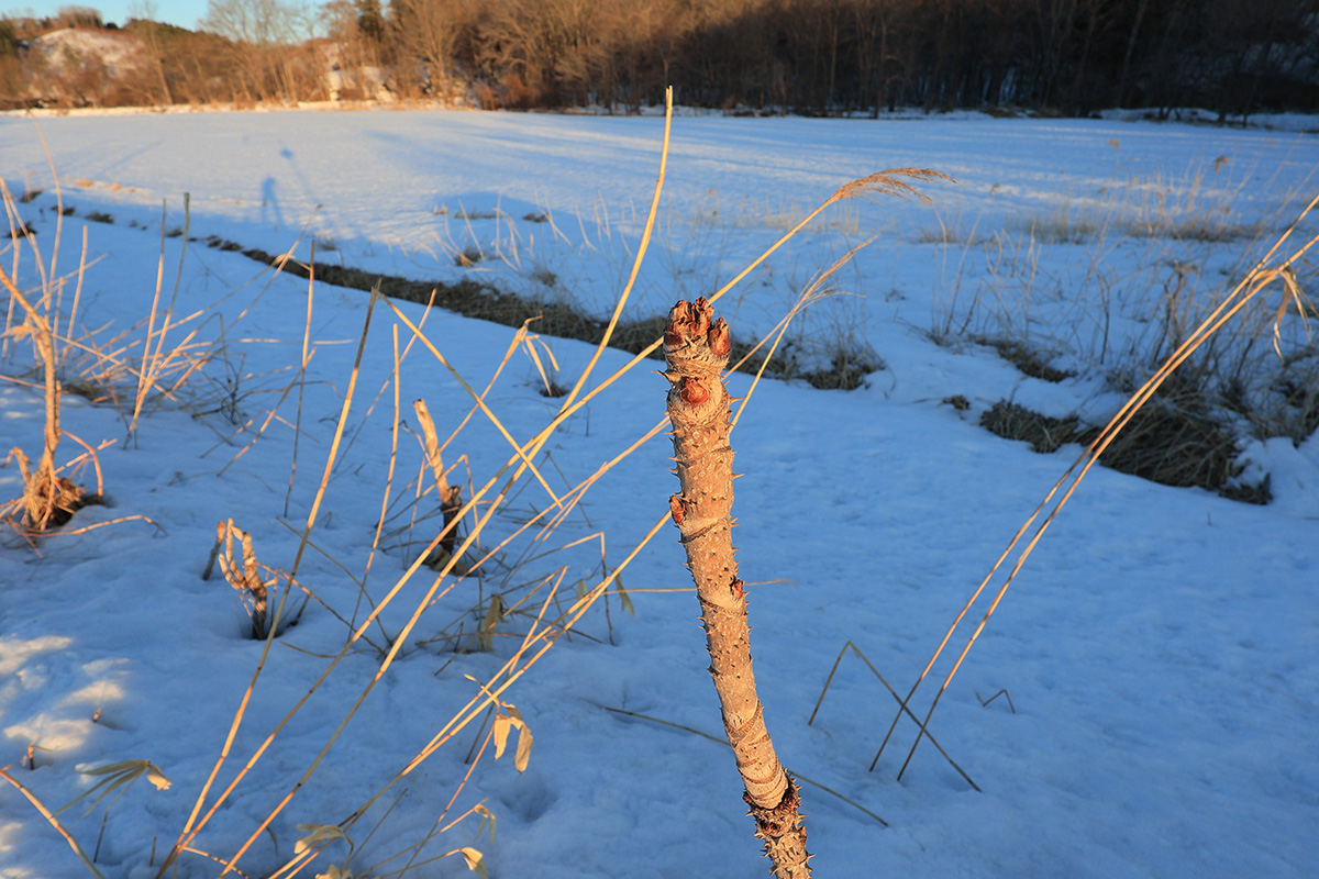 昨年、黒猫さんが見つけたタラの芽だが、よくよく探すと道路際にたくさん生えていた。