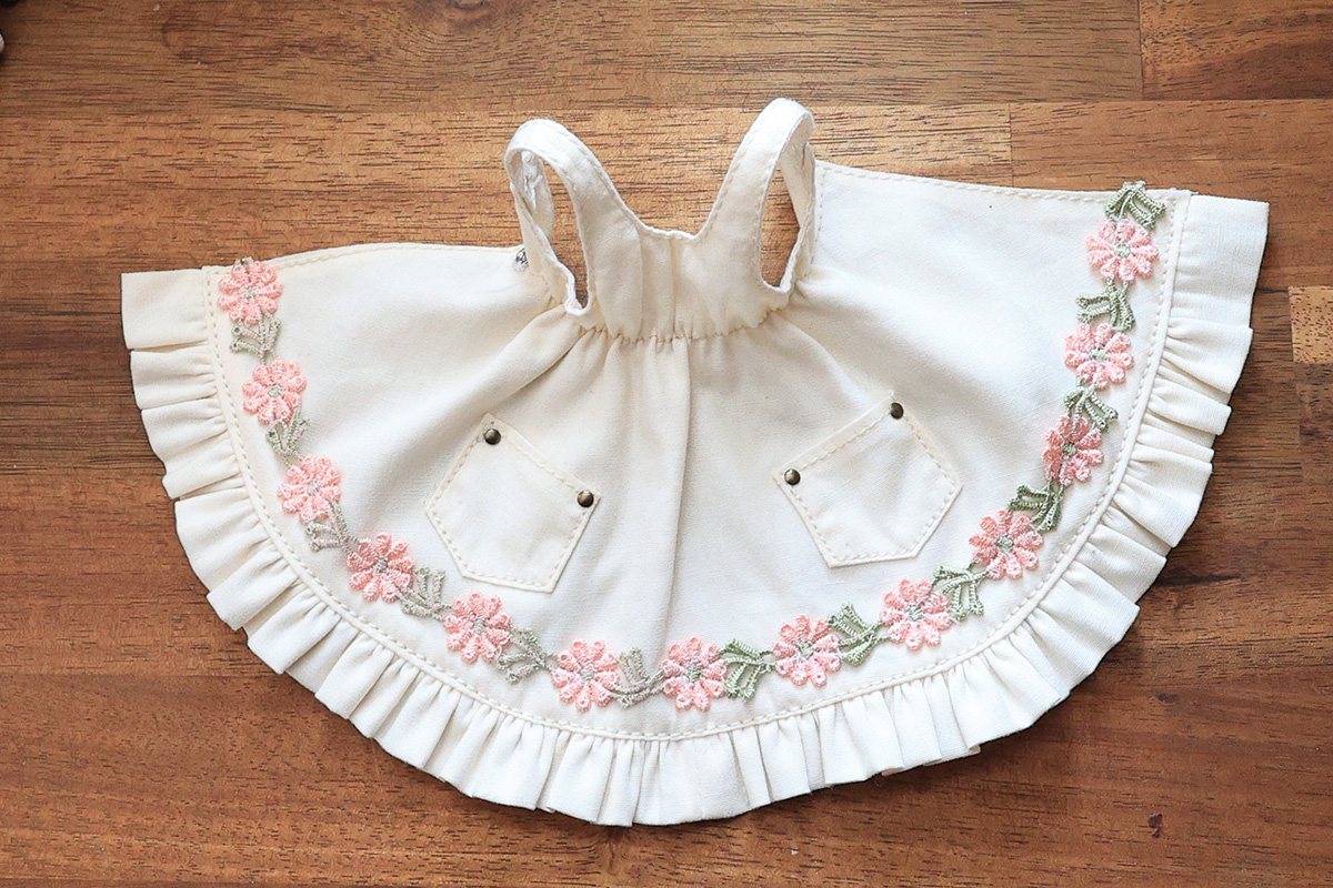 エプロンの全体。肩紐から裾まで総裏仕様。本来は肩へフリルを付けたかったのだけど、表裏でサンドする良い方法が思いつかず断念。