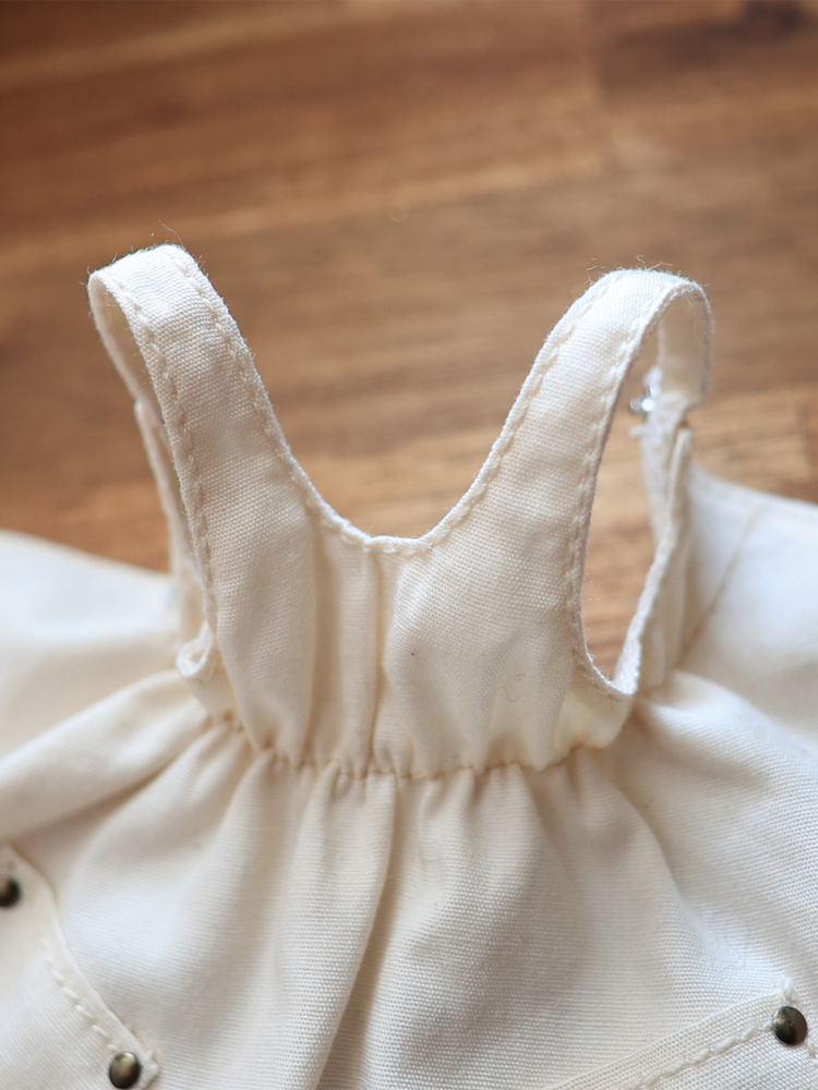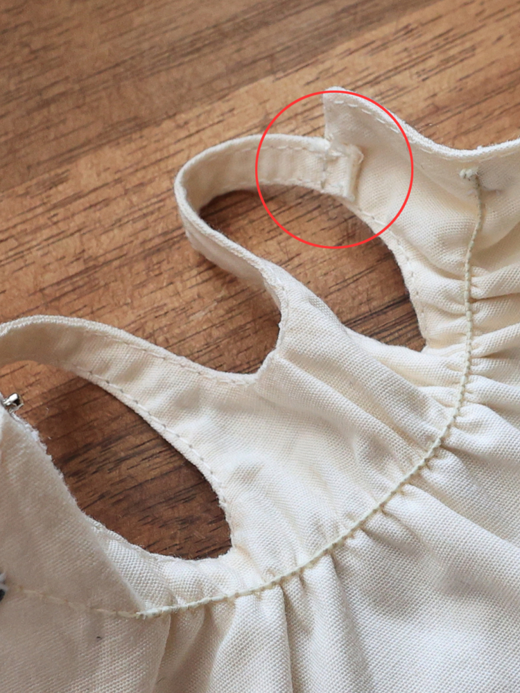 肩フリルも結局は裏返したあとに解き、フリルを挟んで縫うしか無いだろうね。胸当てと肩紐を分離するならやりようがあるけど、肩紐一体なのが個性だったりするしなぁ。あるいは総裏にしないか。でもそれはそれで負けた気がする(。-ω-)
