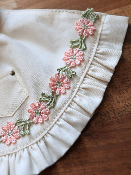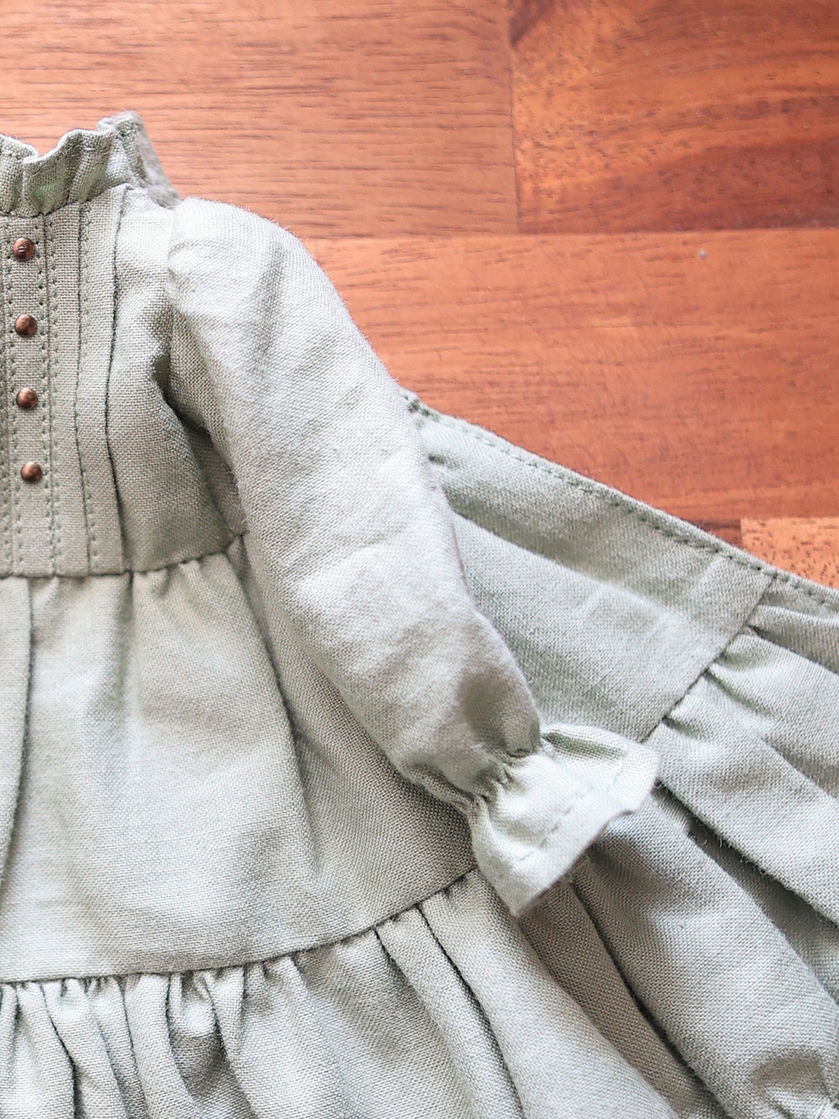 後ろは当然だけどスナップ留め。スナップにする以上は見返しが必要なので、襟から裾まで付けている。裾の折り返しは端だけ粗縫いにしておき、解いて見返しと一緒に縫い直している。三つ折りにすると固くなり綺麗なフリルにならないので二つ折り。ロックミシンも同様だね。無駄に糸を増やして固くなるくらいなら掛けない方がいい。