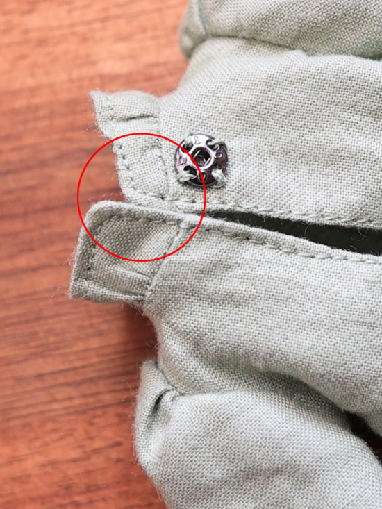 赤丸の箇所、できれば背当ての中へ通してからステッチを入れる方がいいんだろうけど、今回は先走ってステッチを入れてしまったので、スマートじゃないが裏に縫い付けた。外周ステッチは一発で縫いたいので、次回は縫い方を工夫しようと思う。