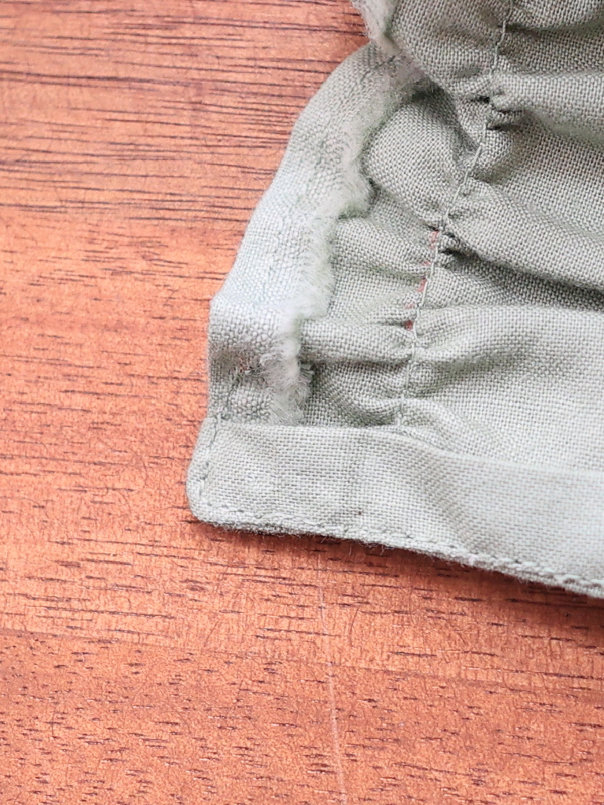 腰はミシンの下糸にゴムカタンをセットして縫っている。軽く伸びる程度のキツさにしておくと腰のラインが出て可愛い。平ゴムだと一発で決める必要があるが、ゴムカタンだと縫い終わったあとに引っ張って調整ができる。厄介なのは端の始末かな。表糸を裏へ通し、ゴムカタンと何度か縛って留めておいた。